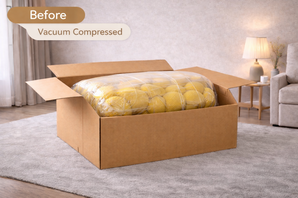 It arrives vacuum-compressed in a compact box, making it easy to carry, move, and fit through any doorway.